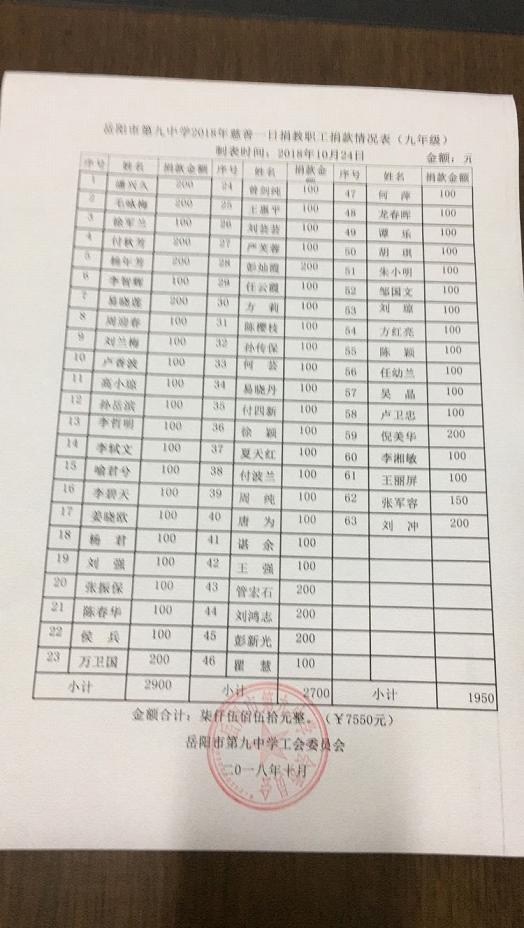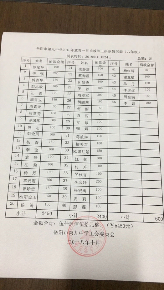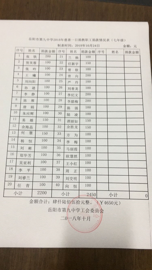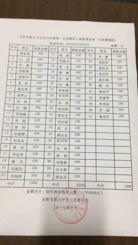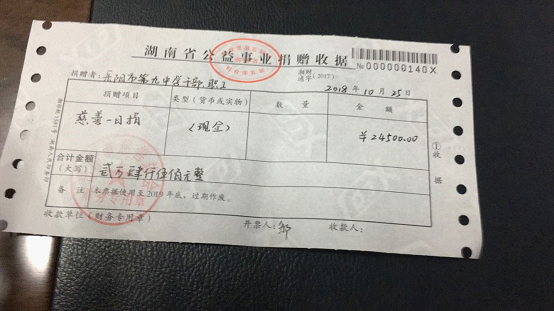 10月15日教工例会上,我校积极响应市教体局号召,召开“慈善一日捐”专题会,组织全体教师参加“一日捐”活动。易昕主席向全体教师发出了“慈善一日捐”活动的倡议,对捐款的期限、办法、参考标准和要求提出了意见。本着“依法组织、广泛发动、重在参与、捐款自愿、鼓励奉献”的原则,捐出自己的一天工资。我校全体教师纷纷捧出挚爱之心,伸出慈善之手,共捐善款24500元,捐款人数200人,为慈善事业尽了自己的一份力。我校教职工的这笔捐款,经公示后已上交岳阳市慈善总会。